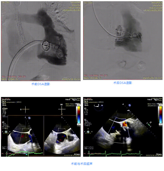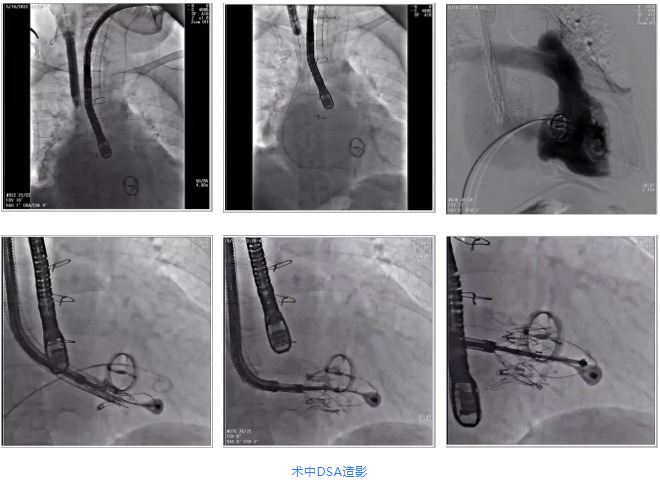 根據(jù)術(shù)前評(píng)估結(jié)果,郭應(yīng)強(qiáng)教授團(tuán)隊(duì)為患者量身定制了手術(shù)策略,決定使用LuX-Valve Plus經(jīng)血管三尖瓣置換系統(tǒng)開(kāi)展手術(shù)治療。手術(shù)在全麻下進(jìn)行,采用經(jīng)右側(cè)頸靜脈入路,在經(jīng)食道超聲和DSA的指引下調(diào)整輸送器角度以達(dá)到正確位置,勾住前瓣后逐步釋放盤(pán)片,盤(pán)片打開(kāi)后順利扎針,最終完成瓣膜植入,輸送器撤出。術(shù)后超聲提示人工三尖瓣同軸性良好,瓣架固定牢靠,無(wú)反流和瓣周漏,術(shù)后三尖瓣平均跨瓣壓差為1 mmHg。