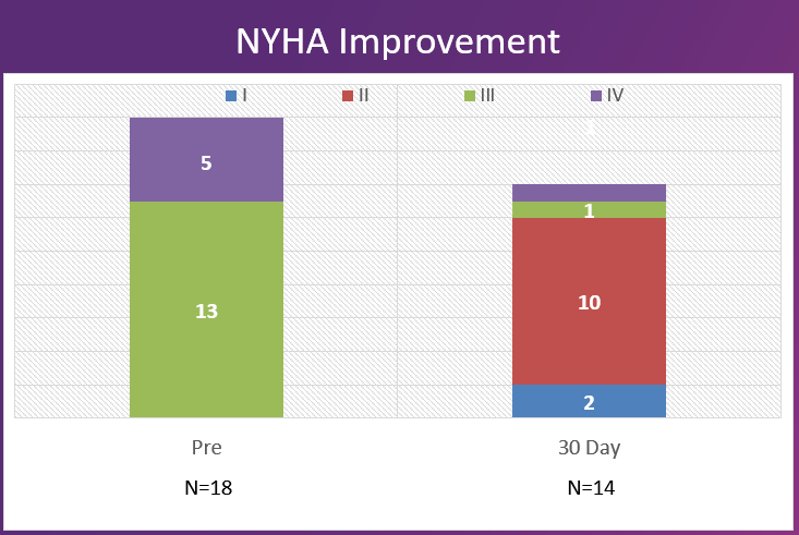 圍術(shù)期無院內(nèi)死亡事件發(fā)生,腦血管事件、心梗和再次手術(shù)干預(yù)發(fā)生率均為0%。僅一例患者在術(shù)后10天因房顫植入永久起搏器,其他患者均無并發(fā)癥發(fā)生。術(shù)后30天隨訪結(jié)果顯示,患者TR嚴(yán)重程度和NYHA心功能分級顯著改善(圖1、圖2)。全因死亡率為5.6%(與器械無關(guān)),心血管死亡、腦血管事件、心梗和再次手術(shù)干預(yù)發(fā)生率均為0%。手術(shù)成功率為100%,無患者轉(zhuǎn)外科開胸。在會議期間,Anson Cheung教授還展示了一個簡短的手術(shù)視頻(見手術(shù)短視頻),分布拆解了LuX-Valve Plus經(jīng)血管(頸靜脈)三尖瓣置換的手術(shù)要點,并強調(diào)了LuX-Valve Plus給術(shù)者帶來的手術(shù)體驗感好、容錯率高,得到了現(xiàn)場醫(yī)生同道的一致好評。