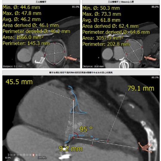 接受本次治療的是一例三尖瓣重度反流的患者,NYHA心功能Ⅲ級。主訴“反復活動后氣促1年,下肢水腫4個月”。入院N末端B型腦鈉肽前體(NT-proBNP)3161pg/ml。心電圖提示:心房顫動,ST-T改變。術(shù)前超聲提示:重度三尖瓣關(guān)閉不全,右心房擴大,三尖瓣收縮期位移(TAPSE)14mm,左房增大,左室收縮功能正常低值,主動脈瓣、二尖瓣機械瓣功能良好。術(shù)前CT評估(圖1):三尖瓣瓣環(huán)(周長換算直徑)大小為46.2mm;入路血管無嚴重迂曲,無鈣化;雙側(cè)冠脈有鈣化。