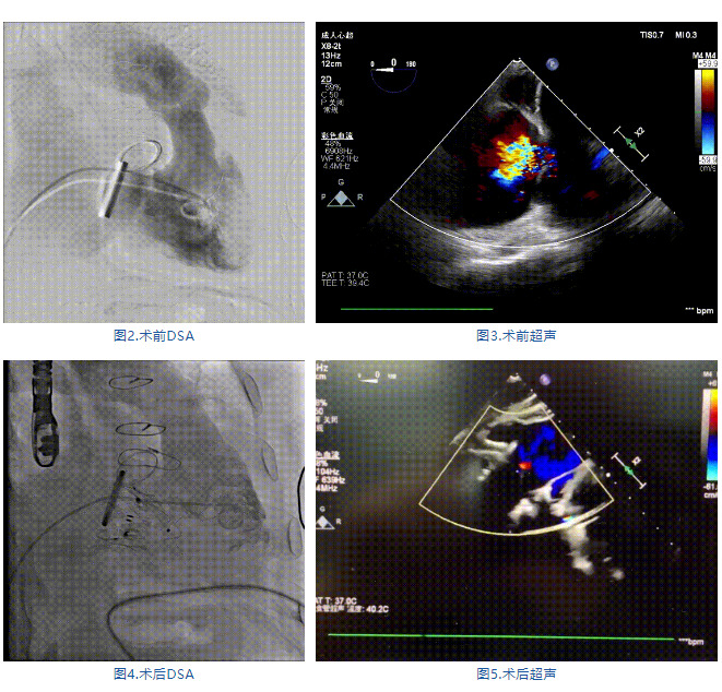 手術(shù)在全麻狀態(tài)下進行,郭惠明教授團隊采用經(jīng)右側(cè)頸靜脈入路的方式送入輸送器進入體內(nèi),并在TEE和DSA的指引下進行。在輸送器進入右室后釋放室間隔錨定裝置,旋轉(zhuǎn)輸送器,使得錨定裝置對準室間隔面;而后釋放前瓣夾持件,確定夾持件位于右室側(cè)釋放LuX-Valve Plus人工瓣膜盤片,再使用DSA和超聲確認盤片是否位于右房側(cè),同時調(diào)整瓣膜的同軸性。緊接著在DSA和超聲的監(jiān)視下調(diào)整室間隔錨定件貼合室間隔,釋放室間隔錨定裝置。再次確認瓣膜的穩(wěn)定性和同軸性后,將輸送器撤出體內(nèi),最終完成LuX-Valve Plus人工瓣膜植入(圖2-5),手術(shù)獲得圓滿成功?;颊咴谑中g(shù)室即刻拔除氣管插管,術(shù)后超聲提示LuX-Valve Plus人工三尖瓣瓣膜同軸性良好,瓣架固定牢靠,無反流和瓣周漏。