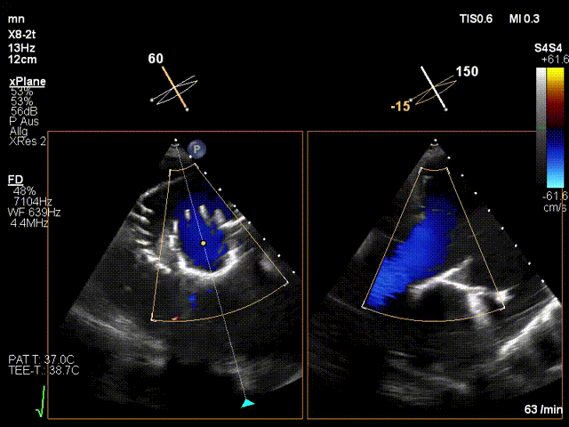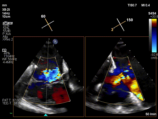 手術(shù)在全麻狀態(tài)下進(jìn)行。在加拿大圣保羅醫(yī)院的Anson Cheung教授的指導(dǎo)參與下,術(shù)者采用經(jīng)右側(cè)頸靜脈入路的方式將輸送器送入患者心臟內(nèi),在TEE及DSA引導(dǎo)下調(diào)整輸送器頭端角度,使得輸送器與三尖瓣瓣環(huán)平面垂直。在輸送器進(jìn)入右心室后釋放室間隔錨定裝置,而后釋放瓣葉夾持件(2個(gè)耳片結(jié)構(gòu))成垂直狀態(tài)。在TEE及DSA確定夾持件固定至三尖瓣葉根部且位于右室側(cè)后釋放人工瓣心房側(cè)盤(pán)片。隨后調(diào)整瓣膜同軸性以及室間隔錨定件位置(貼合室間隔),前推藏針管并固定,進(jìn)而釋放室間隔錨定裝置,并再次確認(rèn)瓣膜位置、穩(wěn)定性及同軸性,合攏輸送鞘后撤出輸送器,完成LuX-Valve Plus人工三尖瓣瓣膜的植入。