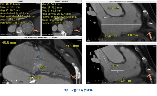 接受本次治療的是一例三尖瓣重度反流的患者,NYHA心功能Ⅲ級(jí)。主訴“反復(fù)活動(dòng)后氣促1年,下肢水腫4個(gè)月”。入院N末端B型腦鈉肽前體(NT-proBNP)3161pg/ml。心電圖提示:心房顫動(dòng),ST-T改變。術(shù)前超聲提示:重度三尖瓣關(guān)閉不全,右心房擴(kuò)大,三尖瓣收縮期位移(TAPSE)14mm,左房增大,左室收縮功能正常低值,主動(dòng)脈瓣、二尖瓣機(jī)械瓣功能良好。術(shù)前CT評(píng)估(圖1):三尖瓣瓣環(huán)(周長(zhǎng)換算直徑)大小為46.2mm;入路血管無(wú)嚴(yán)重迂曲,無(wú)鈣化;雙側(cè)冠脈有鈣化。