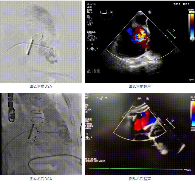 手術(shù)在全麻狀態(tài)下進(jìn)行,郭惠明教授團(tuán)隊(duì)采用經(jīng)右側(cè)頸靜脈入路的方式送入輸送器進(jìn)入體內(nèi),并在TEE和DSA的指引下進(jìn)行。在輸送器進(jìn)入右室后釋放室間隔錨定裝置,旋轉(zhuǎn)輸送器,使得錨定裝置對(duì)準(zhǔn)室間隔面;而后釋放前瓣夾持件,確定夾持件位于右室側(cè)釋放LuX-Valve Plus人工瓣膜盤片,再使用DSA和超聲確認(rèn)盤片是否位于右房側(cè),同時(shí)調(diào)整瓣膜的同軸性。緊接著在DSA和超聲的監(jiān)視下調(diào)整室間隔錨定件貼合室間隔,釋放室間隔錨定裝置。再次確認(rèn)瓣膜的穩(wěn)定性和同軸性后,將輸送器撤出體內(nèi),最終完成LuX-Valve Plus人工瓣膜植入(圖2-5),手術(shù)獲得圓滿成功?;颊咴谑中g(shù)室即刻拔除氣管插管,術(shù)后超聲提示LuX-Valve Plus人工三尖瓣瓣膜同軸性良好,瓣架固定牢靠,無(wú)反流和瓣周漏。