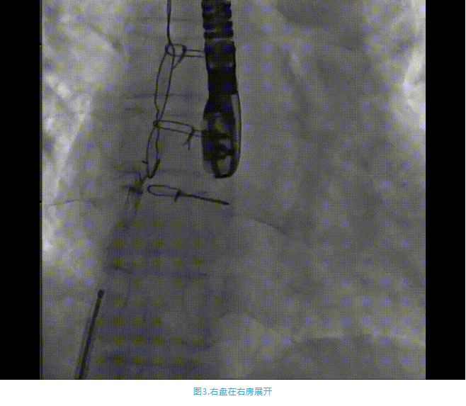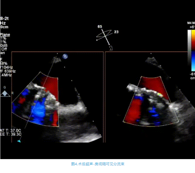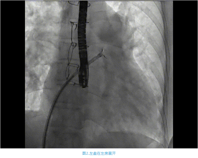 術(shù)中首先在局麻下穿刺股動脈、股靜脈,完成心導(dǎo)管檢查評估后轉(zhuǎn)為全麻,在食道超聲引導(dǎo)下穿刺房間隔,穿刺成功后將加硬導(dǎo)絲送入左上肺靜脈建立軌道,根據(jù)患者病情行球囊預(yù)擴張后植入6mm孔徑房間隔造孔支架,經(jīng)透視及食道超聲評估支架左右盤展開良好,夾持于房間隔兩側(cè),固定穩(wěn)定、位置良好,食道彩超顯示房水平右向左為主分流,分流孔直徑符合預(yù)期大小,心導(dǎo)管檢查評估達到預(yù)期效果,釋放造孔支架。術(shù)后12h患者下床活動,恢復(fù)順利,擬于近日完善術(shù)后評估后出院。