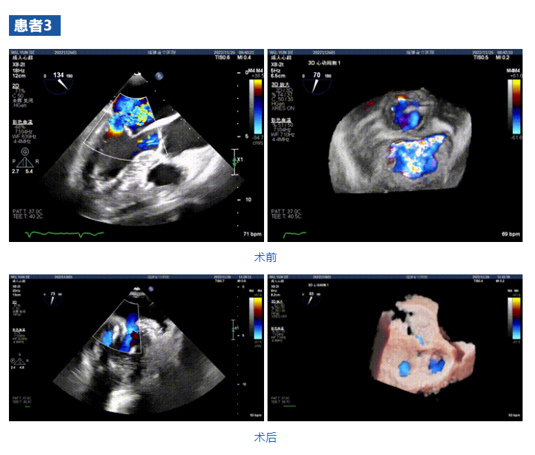 接受治療的三例患者均為器質(zhì)性重度二尖瓣反流(DMR)患者,術(shù)前超聲提示二尖瓣后葉脫垂伴4+反流,左室舒張功能減退。郭延松教授攜同團(tuán)隊(duì)成員陳新敬副教授和洪景宣、方明程、楊清勇主治醫(yī)師、心外科丁杭主任以及超聲科賴(lài)寶春、葉振盛主治醫(yī)師共同進(jìn)行病情討論??紤]到患者高齡、基礎(chǔ)疾病多、STS評(píng)分高,為外科手術(shù)極高危患者,不適合進(jìn)行外科開(kāi)胸二尖瓣手術(shù),因此決定為患者實(shí)施經(jīng)導(dǎo)管緣對(duì)緣修復(fù)介入術(shù)(JensClip經(jīng)導(dǎo)管瓣膜夾系統(tǒng))。