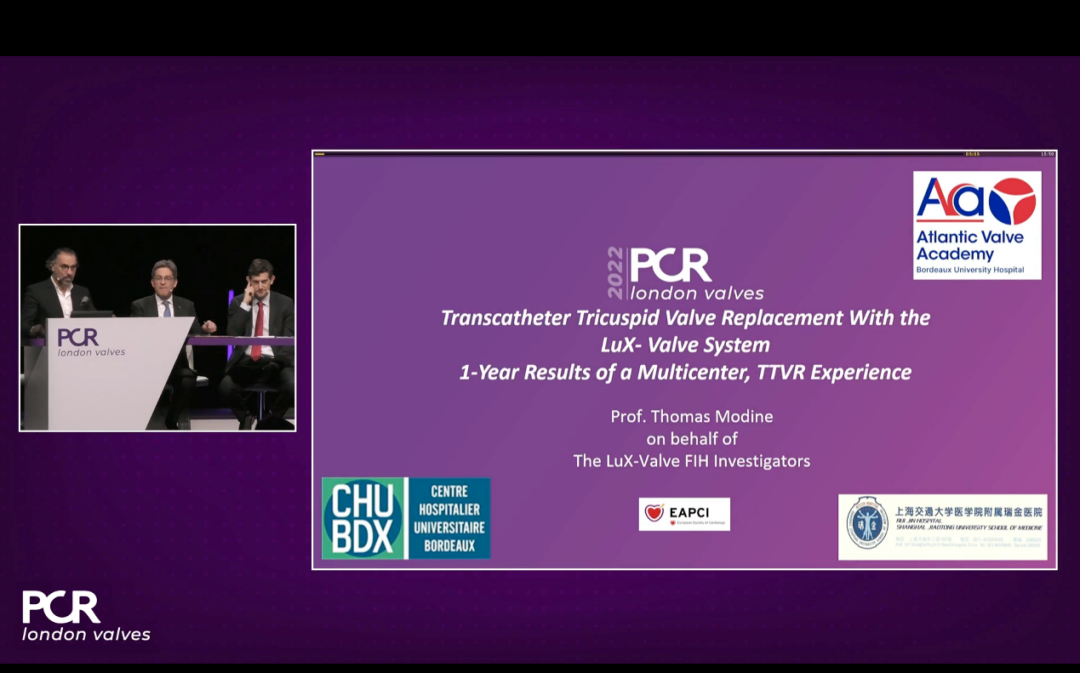 在本次大會上,法國波爾多大學(xué)醫(yī)院Thomas Modine教授公布了LuX-Valve FIM一年臨床數(shù)據(jù),并線上指導(dǎo)德國Mainz中心Ralph Stephan von Bardeleben教授進(jìn)行了其所在中心的LuX-Valve Plus首例植入。在亮眼的臨床數(shù)據(jù)與精彩的手術(shù)實(shí)踐結(jié)合中,與會專家充分感受到了三尖瓣介入領(lǐng)域中國原創(chuàng)器械的魅力。
