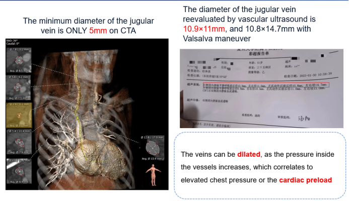 在早期篩選的病人中,有部分病人的頸內(nèi)靜脈最小直徑小于8.5mm,導(dǎo)致無法接受Lux-Valve Plus治療。然而在之后的臨床實踐中,術(shù)者們發(fā)現(xiàn)通過增加胸腔壓力或心臟前負荷,頸內(nèi)靜脈可以被擴張。如下圖中的病例,術(shù)前的頸部CT顯示頸內(nèi)靜脈最小徑僅為5mm,然而乏式動作(Valsalva maneuver)后血管內(nèi)超聲測得的內(nèi)徑為11mm。這樣的病例提示不能僅僅依靠術(shù)前的頸部CTA來作為唯一的血管入路排除標準,通過一些術(shù)前準備,頸內(nèi)靜脈的內(nèi)徑可以被擴張,而血管內(nèi)超聲可以監(jiān)測這一變化。