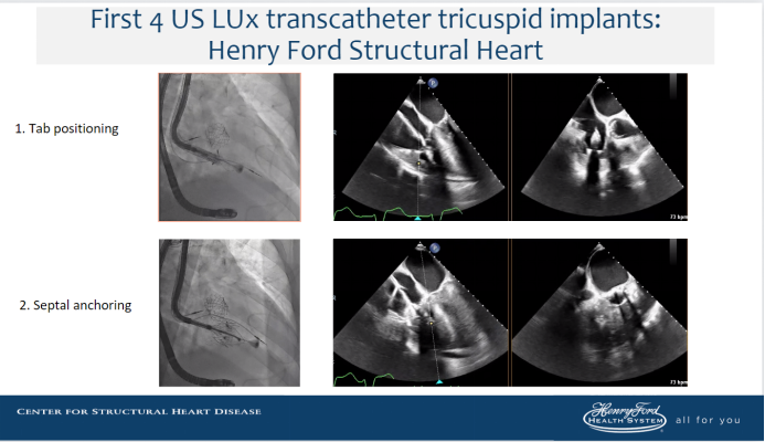 Dee Dee Wang教授分享了Henry Ford Hospital前4例Lux-Valve Plus的植入經(jīng)驗,并提示術(shù)中確定瓣葉夾持鍵的位置處于三尖瓣瓣環(huán)下方(右心室側(cè)),以及室間隔固定片與室間隔的相對位置關(guān)系是最關(guān)鍵的兩個步驟。使用經(jīng)胃底短軸切面,有時配合右室流入/流出道切面的X-plane就能較容易地獲取相關(guān)影像。由于Lux-Valve Plus對超聲影像的要求較低,手術(shù)過程會相對比較流暢。