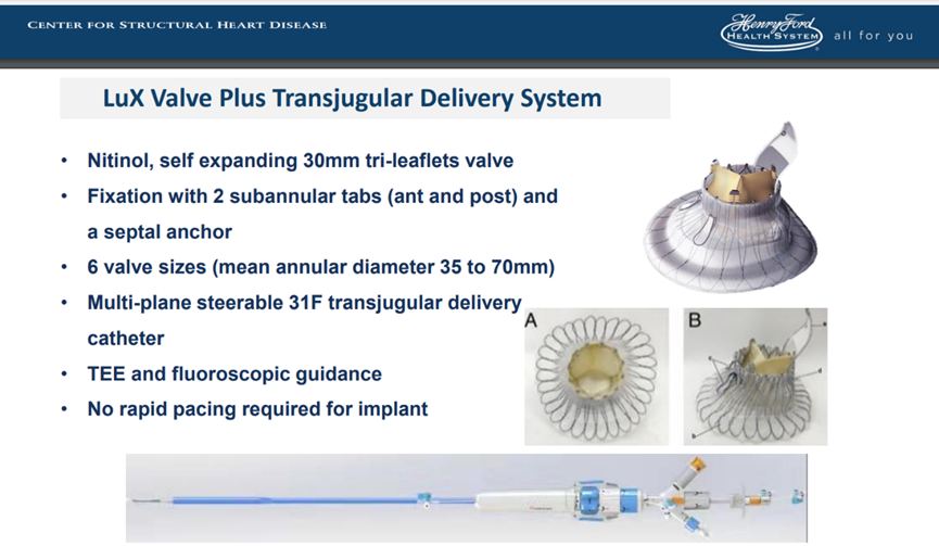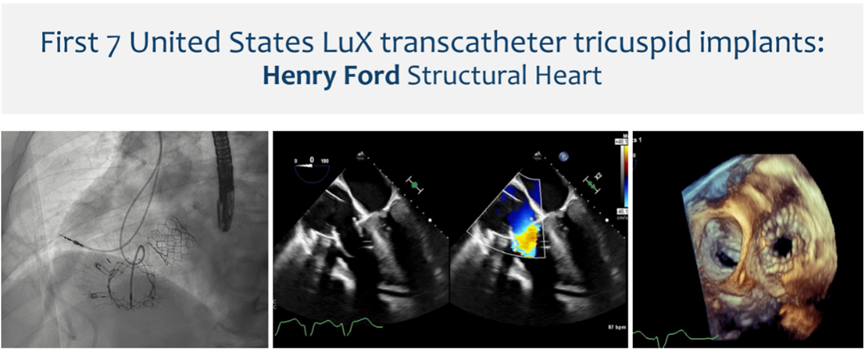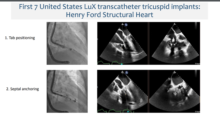 Dee Dee Wang教授隨后分享了Henry Ford Hospital前7例LuX-Valve Plus的植入經(jīng)驗(yàn),并提示術(shù)中確定瓣葉夾持鍵的位置處于三尖瓣瓣環(huán)下方(右心室側(cè)),以及室間隔固定片與室間隔的相對位置關(guān)系是最關(guān)鍵的兩個(gè)步驟。通過經(jīng)胃底短軸切面,配合右室流入/流出道切面的X-plane就能較容易地獲取相關(guān)影像。由于LuX-Valve Plus對超聲影像的要求較低,手術(shù)過程簡單易操作。