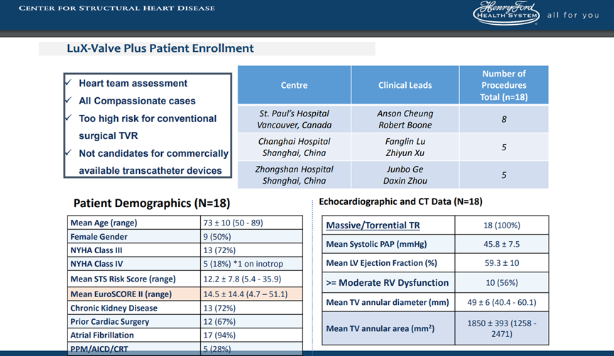 Dee Dee Wang教授首先介紹了LuX-Valve Plus救治性臨床研究隨訪30天結(jié)果。該研究在北美地區(qū)及中國地區(qū)同步開展,共納入18例患者,女性患者占比50%,患者平均年齡為73±10歲,心功能(NYHA分級)均為Ⅲ級/Ⅳ級;平均STS評分為12.2±7.8,平均EuroSCORE II評分為14.5±14.4。