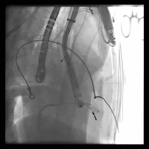 術(shù)中DSA顯示起搏器導(dǎo)線(xiàn)的干擾,右心室造影確定瓣環(huán)位置,操作空間小