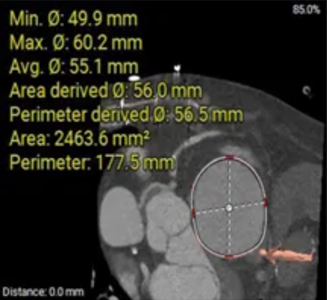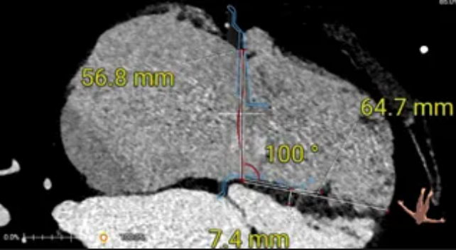 術(shù)前CT測(cè)量:三尖瓣瓣環(huán)最大徑60.2mm,周長(zhǎng)平均徑56.5mm,瓣環(huán)顯著擴(kuò)張。