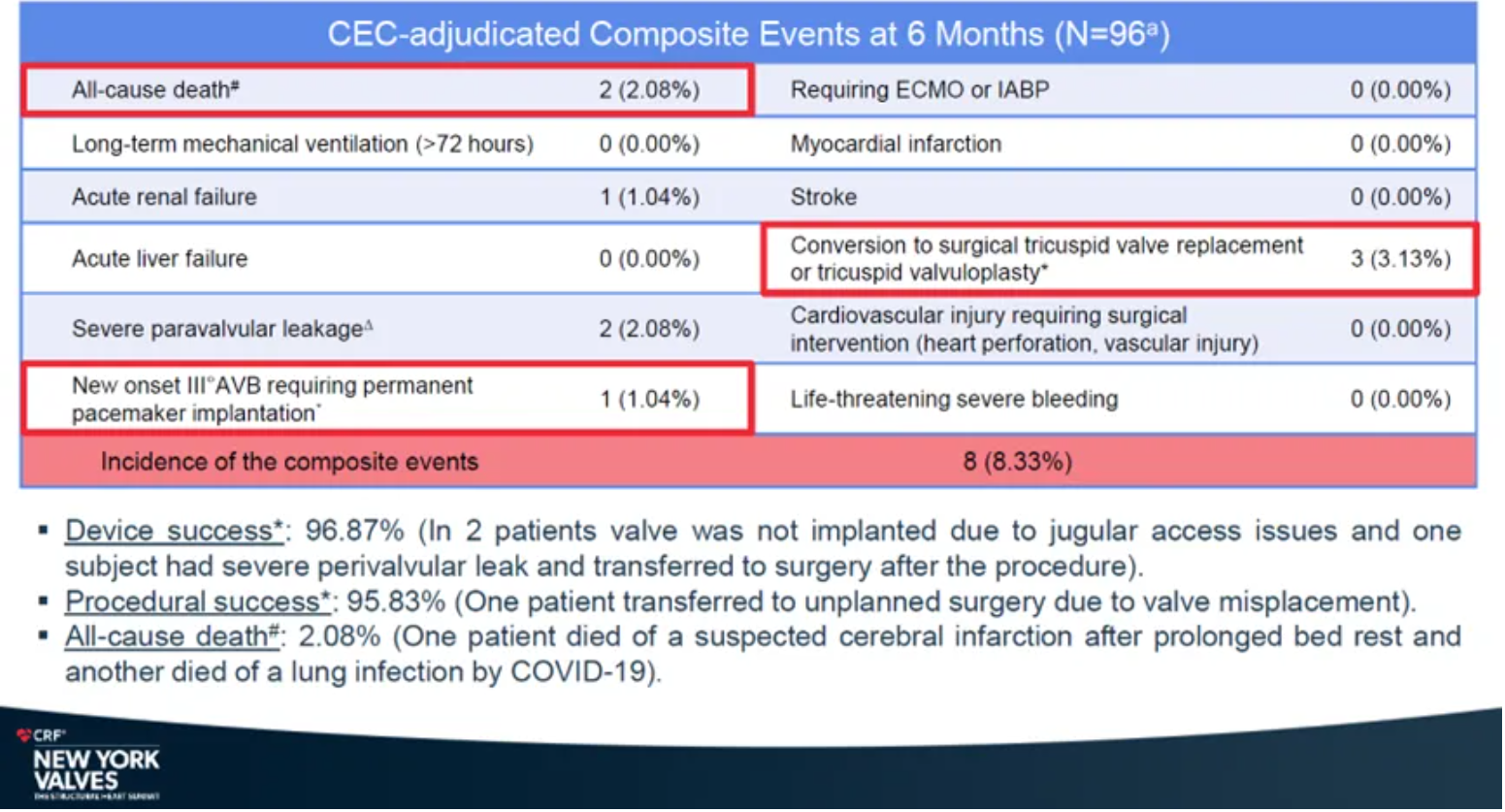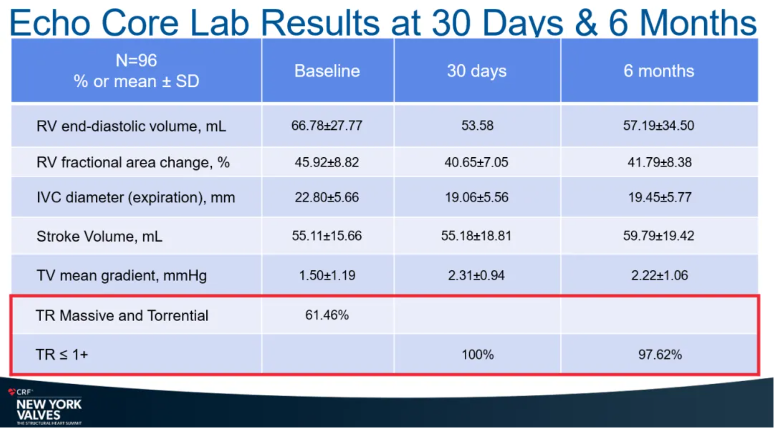 安全性結果顯示,復合事件發(fā)生率為8.33%。心梗、卒中、使用ECMO(體外膜肺氧合)或IABP(主動脈內(nèi)球囊反搏)、急性肝功能衰竭、長期機械通氣(>72小時)、需要外科干預的心血管損傷(心臟穿孔、血管損傷)、危及生命的大出血事件發(fā)生率均為0。全因死亡率僅為2.08%,急性腎臟衰竭、重度瓣周漏和中轉外科三尖瓣置換或成形術發(fā)生率分別為1.04%、2.08%和3.13%。新發(fā)III度房室傳導阻滯需植入永久心臟起搏器的發(fā)生率僅1.04%。