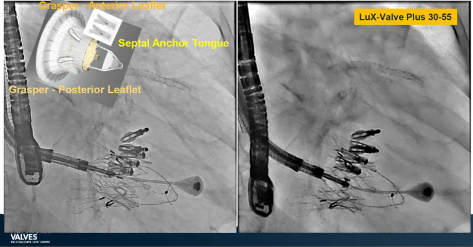 本次術式中,LuX-Valve Plus的植入緊隨二尖瓣修復術式之后,且并未取出前期植入的三尖瓣修復夾,這意味著LuX-Valve Plus在患者有過二尖瓣和三尖瓣修復夾植入情況下的兼容性,并且?guī)砹擞行У闹委熃Y果。此外,這不僅體現(xiàn)了LuX-Valve Plus可以與二尖瓣術式并行,更可以兼容三尖瓣原位的其他修復夾產(chǎn)品。
