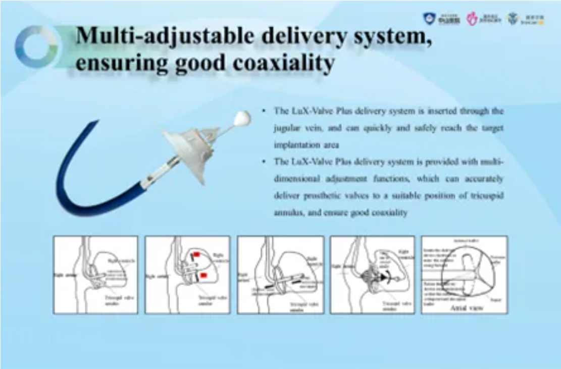 2022年,隨著復(fù)旦大學(xué)附屬中山醫(yī)院的葛均波院士牽頭完成FIM研究并將結(jié)果發(fā)表于國(guó)際頂級(jí)期刊《Eurointervention》,LuX-Valve Plus獲得國(guó)內(nèi)外的廣泛關(guān)注。有別于傳統(tǒng)經(jīng)股靜脈入路三尖瓣介入手術(shù)器械,LuX-Valve Plus創(chuàng)新性采用經(jīng)頸靜脈作為手術(shù)主入路,可將人工瓣膜快速送達(dá)目標(biāo)手術(shù)區(qū)域,整體輸送行程較短,有效降低入路周邊解剖組織并發(fā)癥及術(shù)中出血風(fēng)險(xiǎn)。同時(shí),魏來(lái)教授表示,LuX-Valve Plus輸送系統(tǒng)所具有的聯(lián)動(dòng)調(diào)彎功能,面對(duì)右心房較小的患者,可在進(jìn)入右心房后快速進(jìn)行調(diào)彎遞送,從容調(diào)整,快速同軸,降低手術(shù)整體風(fēng)險(xiǎn)并安全進(jìn)行手術(shù)。