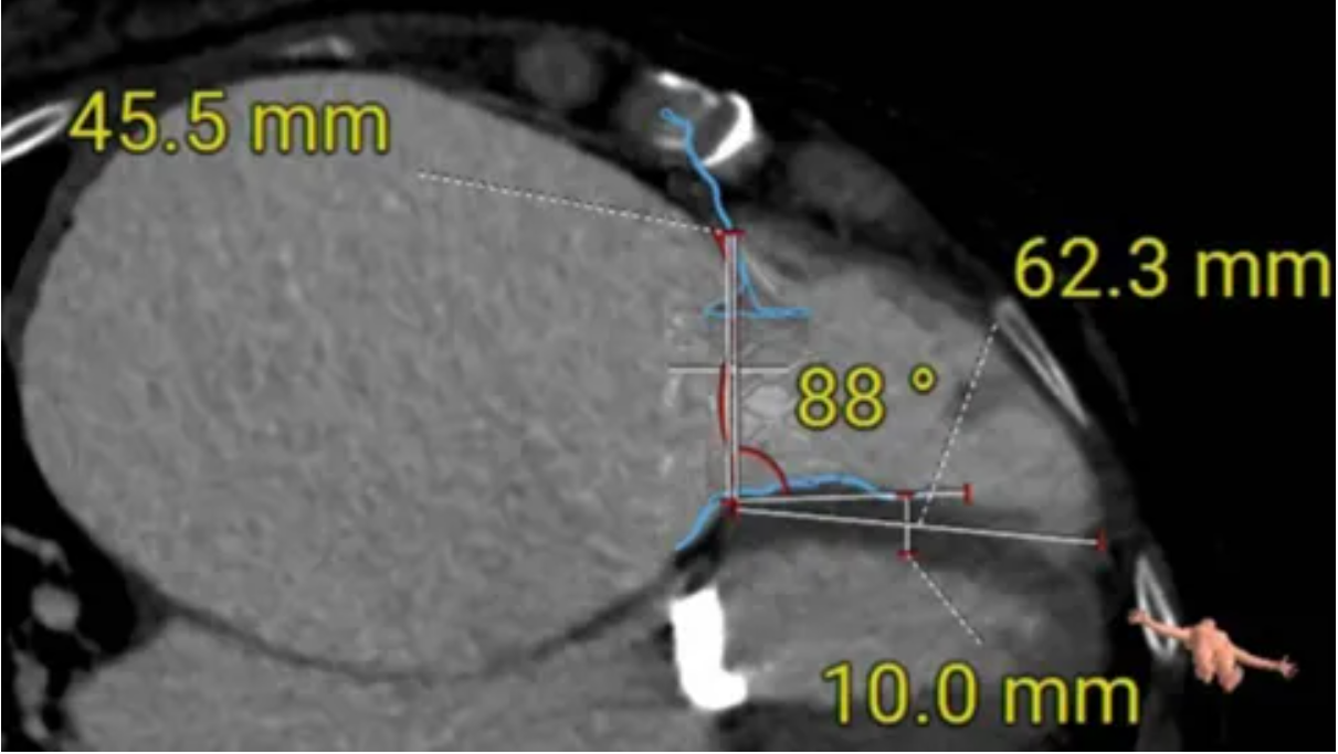 經(jīng)過(guò)術(shù)前討論,患者為重度三尖瓣返流,基礎(chǔ)情況差,外科高危風(fēng)險(xiǎn),右心房容積明顯增大,三尖瓣瓣環(huán)顯著擴(kuò)張,經(jīng)術(shù)前CT測(cè)量,三尖瓣瓣環(huán)最大徑53.9mm,周長(zhǎng)平均徑49mm,推薦經(jīng)頸靜脈行三尖瓣置換術(shù),推薦使用JS/TTVI-30-55瓣膜。