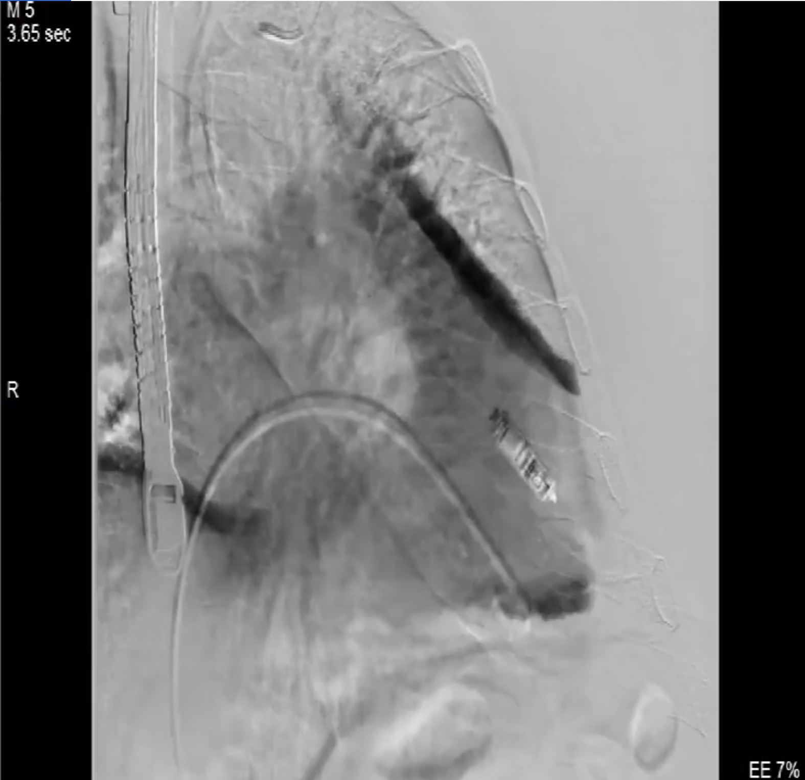 術(shù)前DSA造影可見三尖瓣大量返流呈瀑布樣,右室偏間隔側(cè)可見無導(dǎo)線起搏器一枚。