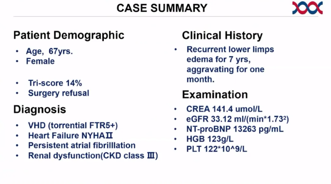 67歲老年女性,雙下肢水腫7年,加重伴氣促1年,既往診斷右心衰竭,心功能III級,伴不完全性右束支傳導(dǎo)阻滯,輕中度二尖瓣關(guān)閉不全,心臟擴(kuò)大。初步診斷以非風(fēng)濕性三尖瓣關(guān)閉不全(極重度)合并擴(kuò)張型心肌病收住入院,Tri-Score 14%, eGRF 33.12ml,NT-proBNP 13263 pg/mL。